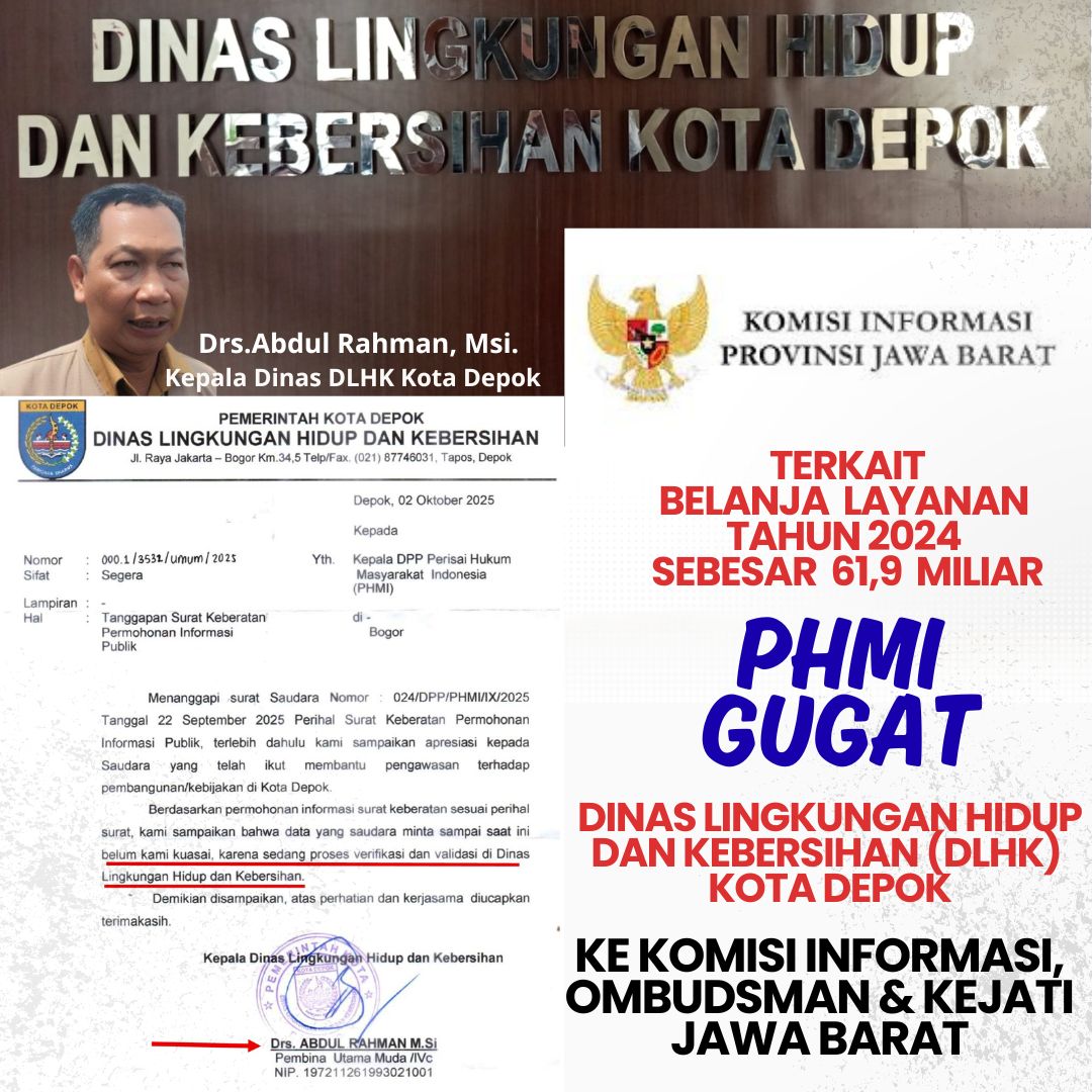 PublikasiPendidika.com | Depok – Perisai Hukum Masyarakat Indonesia (PHMI) menggugat Dinas Lingkungan Hidup dan Kebersihan Kota Depok ke Komisi Informasi Jawa Barat, sebagaimana dituangkan dalam surat gugatan nomor 61/X/25 pada tanggal 17 Oktober 2025.