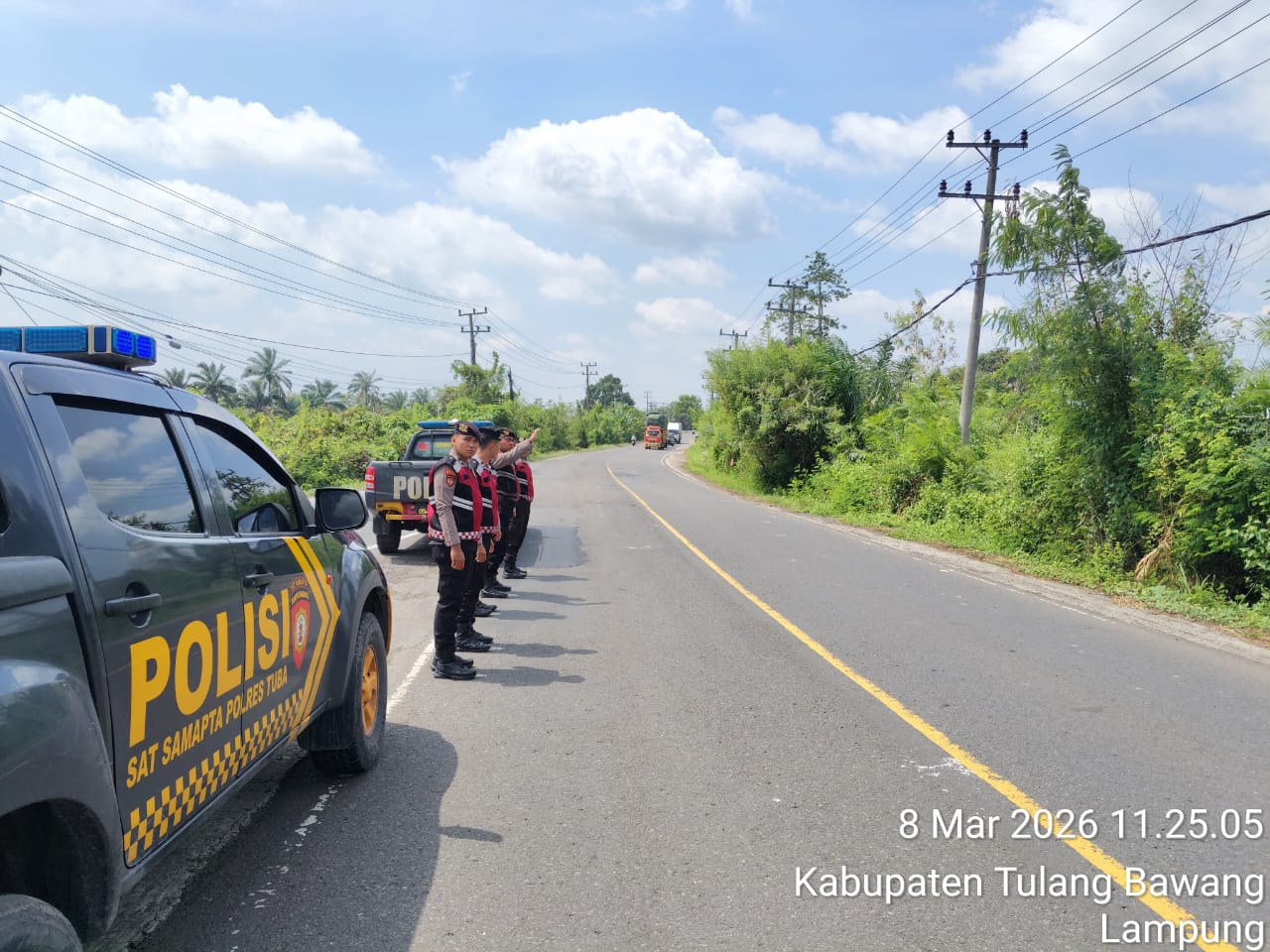 Kegiatan patroli yang berfokus pada wilayah hukum Polres Tulang Bawang ini mencakup dua lokasi strategis, yakni Jalan Lintas Timur Kecamatan Menggala Timur Kabupaten Tulang Bawang dan Wisata Cakat Raya Kecamatan Menggala Kabupaten Tulang Bawang. Tim patroli yang dipimpin langsung oleh Kasat Samapta Polres Tulang Bawang, IPTU I Ketut Suwardi Artono, S.H., M.M., dan terdiri dari personil handal yaitu AIPTU Bambang Hadral, Bripka Rahmat Septo, Bripda Rayhan Wirayudha G, Bripda Riki Setiawan, Bripda M. Rakha Abiyu, serta Bripda Aldo Fernando, bergerak cepat dan presisi dalam menjalankan tugas mulia ini.