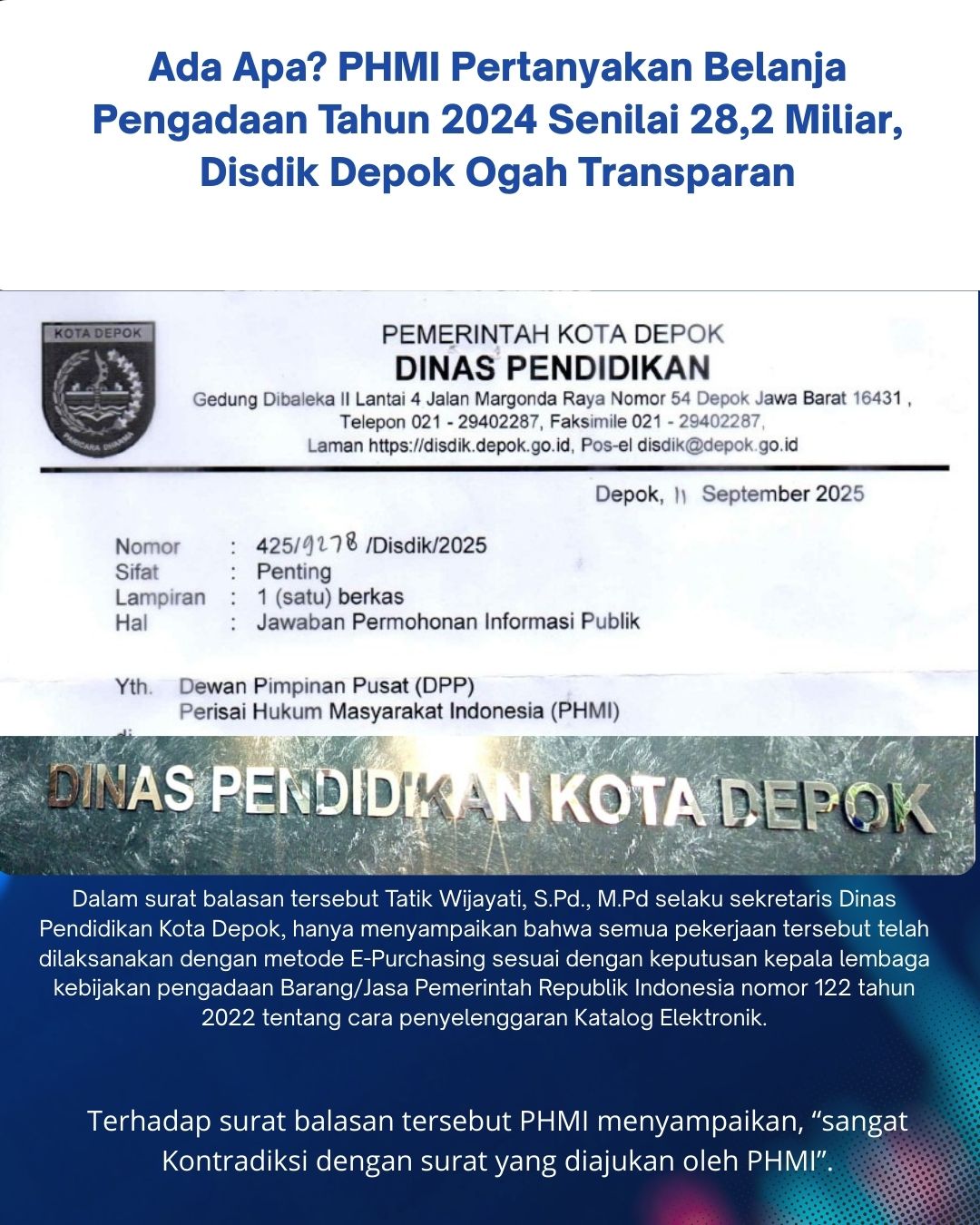 Kemudian PHMI menerima surat balasan dari dari Dinas Pendidikan Kota Depok pada tanggal 12 September 2025 dengan Nomor surat 425/9278/Disdik/2025 perihal Jawaban Informasi Publik.