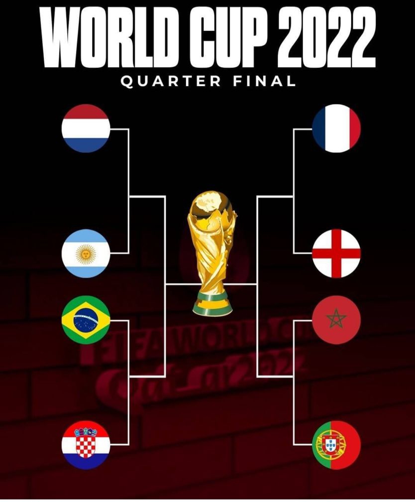 Daftar Tim 8 Besar Piala Dunia 2022: Belanda, Argentina, Prancis, Inggris, Kroasia, Brasil, Maroko, Portugal.