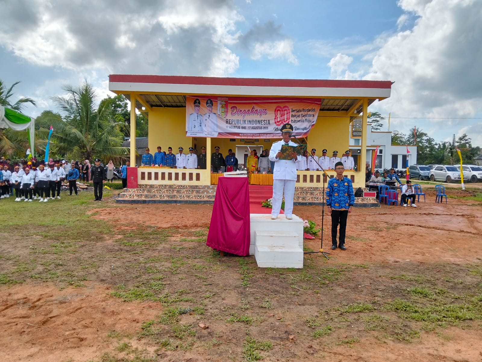 TulangBawang,Lampung, | PublikasiPendidikan,com-upacara Hari Ulang tahun kemerdekaan Republik Indonesia Pak Camat Romli,Spd,MM,dilaksanakan di lapangan Wono Agung ke camatan Rawa jitu selatan kabupaten Tulang bawang.