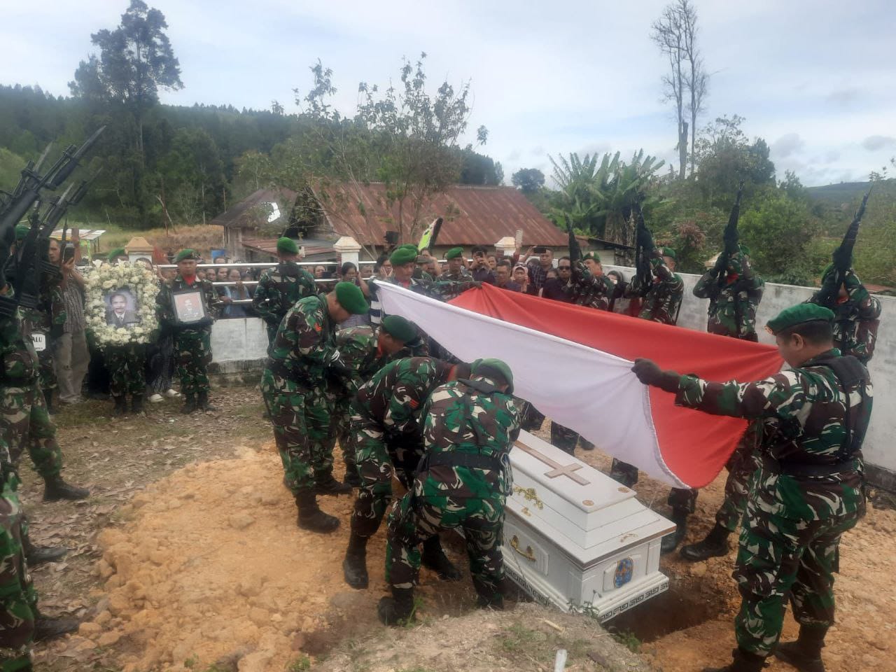 Prosesi upacara pemakaman secara militer bertempat di Desa Aek raja 3 Kecamatan Parmonangan Kabupaten Taput Provinsi Sumatera Utara, Rabu (30/10/2024)
