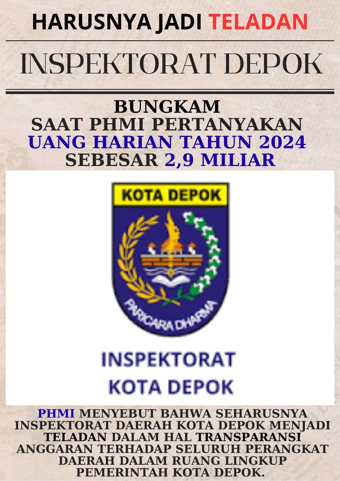PublikasiPendidikan.com | PHMI | Depok – Perisai Hukum Masyarakat Indonesia (PHMI) menyebut bahwa seharusnya Inspektorat Daerah Kota Depok menjadi teladan dalam hal transparansi anggaran terhadap seluruh perangkat daerah di ruang lingkup pemerintah kota depok.