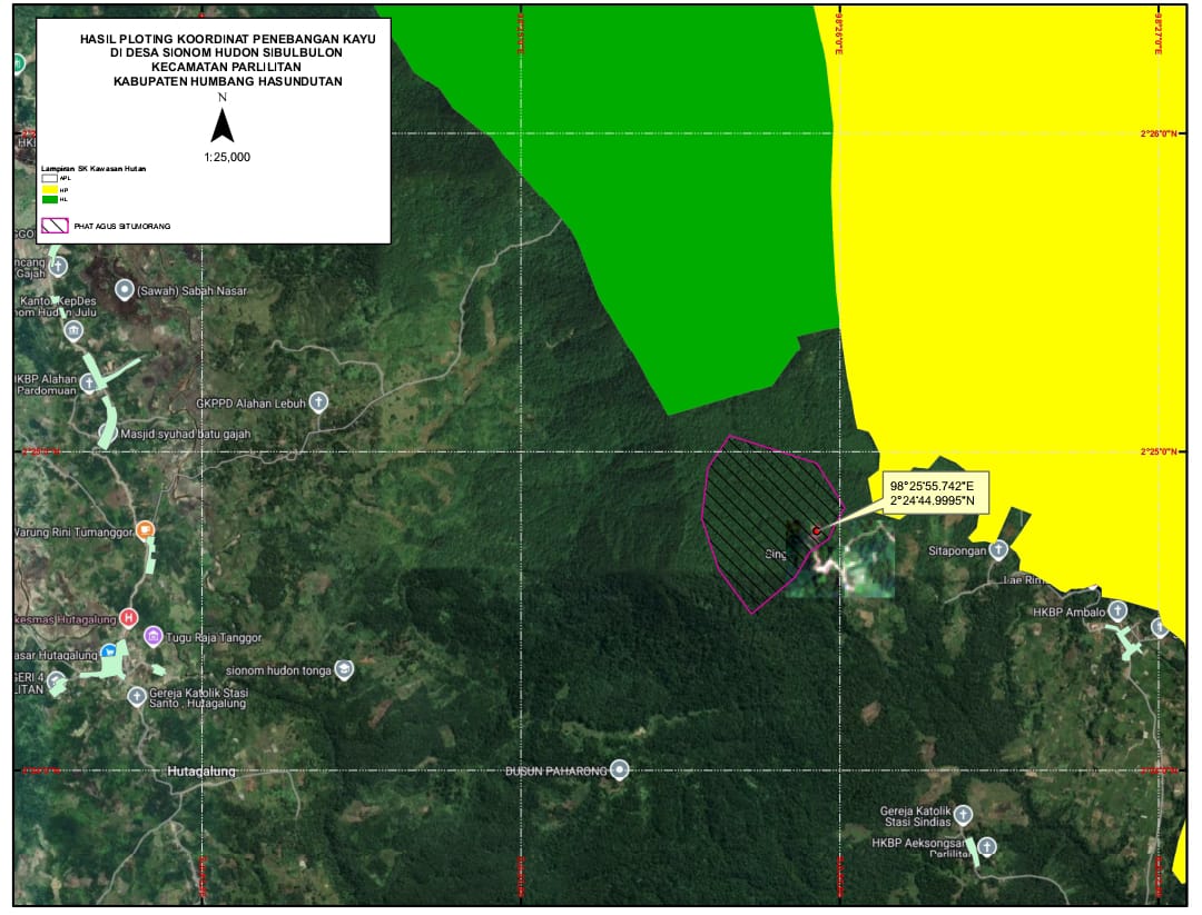 Sebagai bahan pendukung, denah lokasi dan data geospasial menunjukkan bahwa titik tebangan tidak berada di kawasan hutan negara, melainkan pada APL. Hal ini memperkuat bahwa secara hukum, aktivitas penebangan di sana dimungkinkan apabila sesuai prosedur, termasuk pemenuhan administrasi dan dokumen pengangkutan hasil hutan.