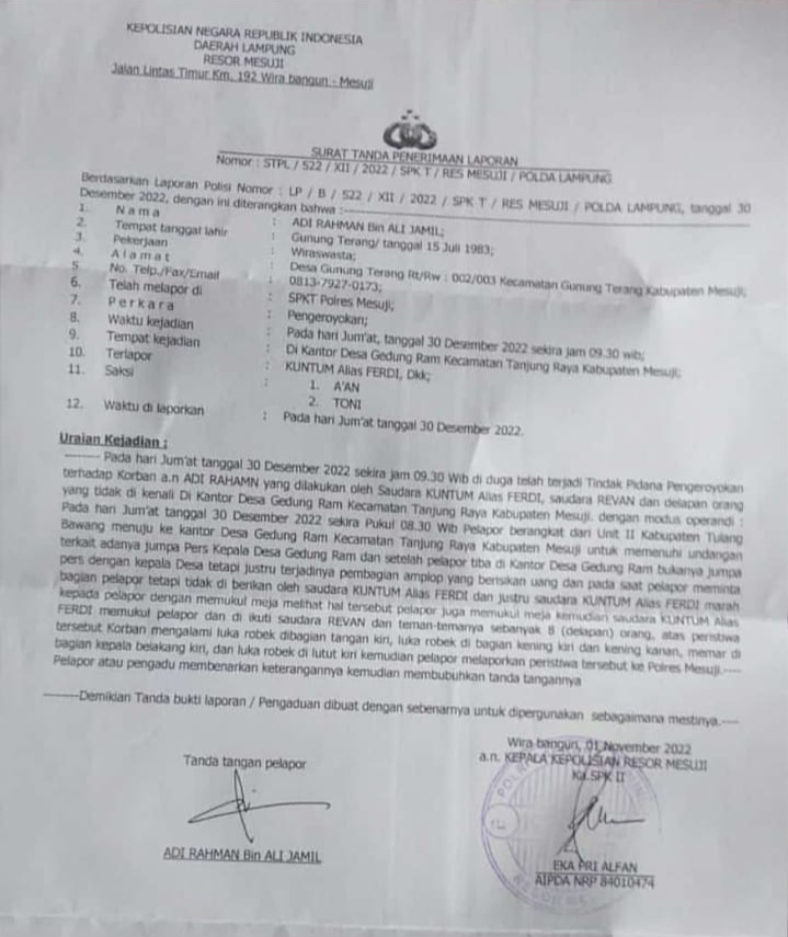 Adapun Kronologis : pada hari Jum’at tanggal 30/12/2022 sekira jam 09.30 WIB diduga telah terjadi tindak pidana pengeroyokan terhadap korban A.N. Adi Rahman yang dilakukan oleh saudara Kuntum alias, saudara Revan dan 8.(delapan) orang yang tidak dikenal di kantor desa Gedung RAM kecamatan Tanjung Raya kabupaten Mesuji dengan modus Operandi: pada hari Jum’at tanggal 30/12/2022. Sekira pukul 08.30.wib pelapor berangkat dari unit II kabupaten tulang bawang menuju kantor Gedung RAM kecamatan Tanjung Raya kabupaten Mesuji untuk memenuhi undangan terkait adanya jumpa pers kepala desa.