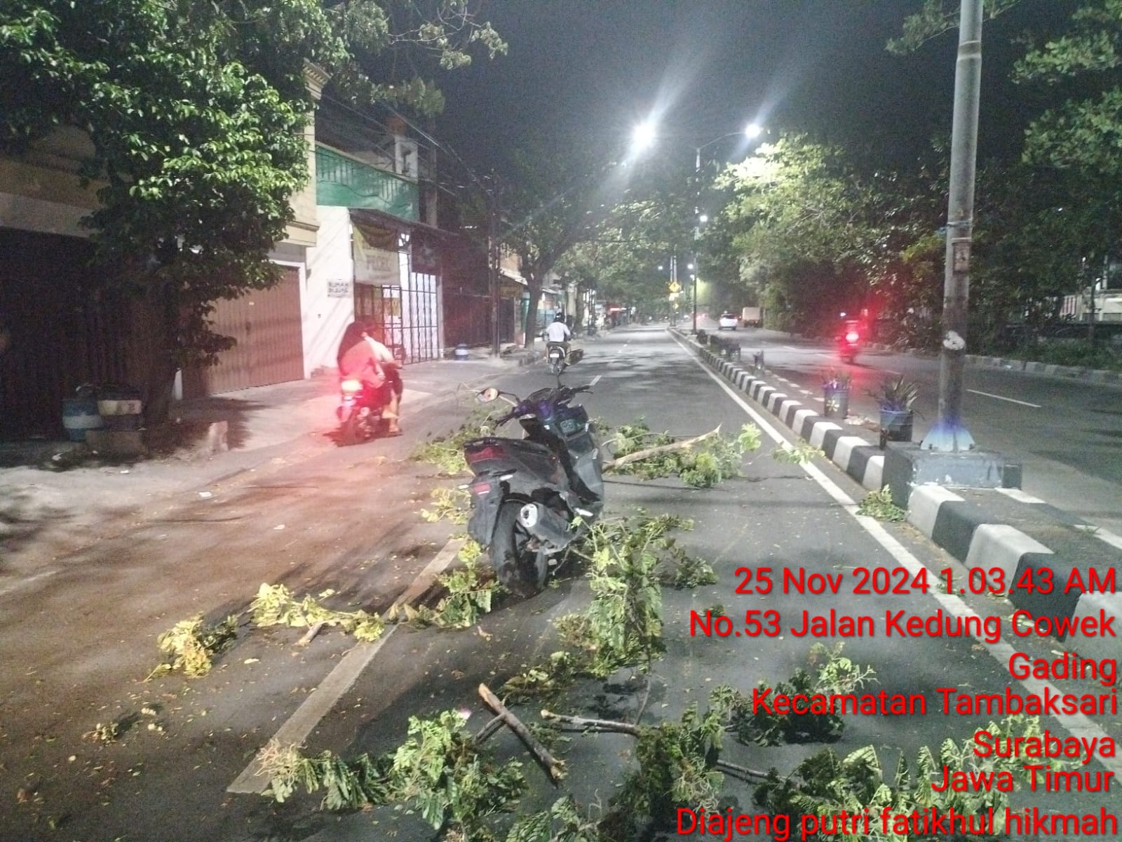 PublikasiPendidikan.com | Tambak Sari- Sebuah insiden tragis terjadi di Jalan Kedung Cowek kelurahan Gading kecamatan Tambak Sari ketika sebuah pohon besar tumbang dan menimpa pengendara yang tengah melintas. Kejadian nahas tersebut mengakibatkan Salah Satu Pimpinan Redaksi Media mengalami Jatuh Sehingga Motor Rusak dan shock dengan kejadian ini ( 25 -11-2024) 01.10.