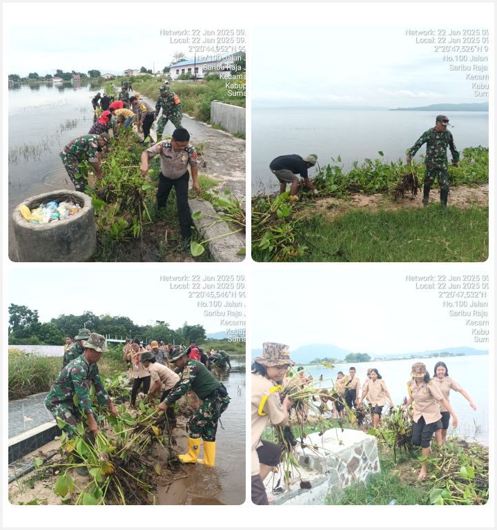 BALIGE – Kodim 0210/TU bersama Polri, masyarakat dan peserta didik Pramuka membersihkan sekaligus mengangkat dan membersihkan eceng gondok di Danau Toba yang berada di Pantai Janjimaria Desa Sariburaja Janjimaria Kelurahan Balige Kabupaten Toba Provinsi Sumatera Utara, Rabu (22/1/2025)