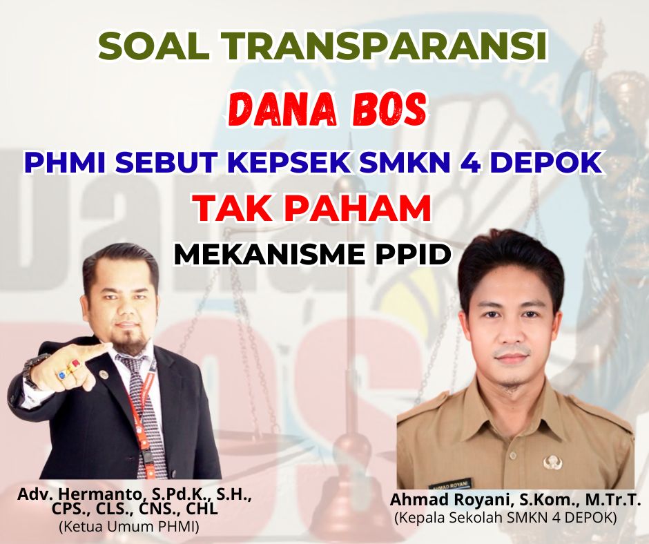 PublikasiPendidikan.com | PHMI | Kota Depok – Perisai Hukum Masyarakat Indonesia (PHMI) mempertanyakan anggaran transparansi alokasi dan Penggunaan Dana BOS pada SMKN 4 Depok 3 tahun terahir. Hal itu disampaikan langsung oleh Adv. Hermanto, S.Pd.K., S.H., CPS., CLS., CNS., CHL selaku ketua umum PHMI pada awak media 02/3/26.