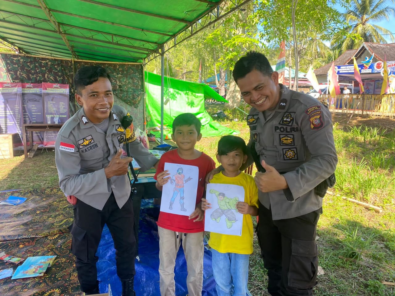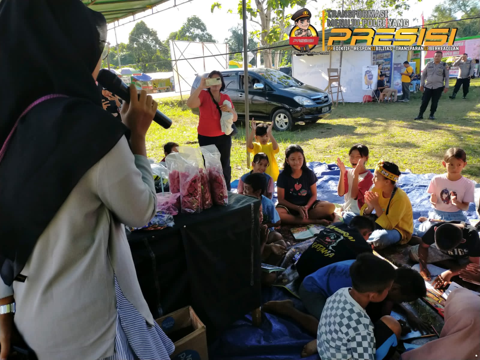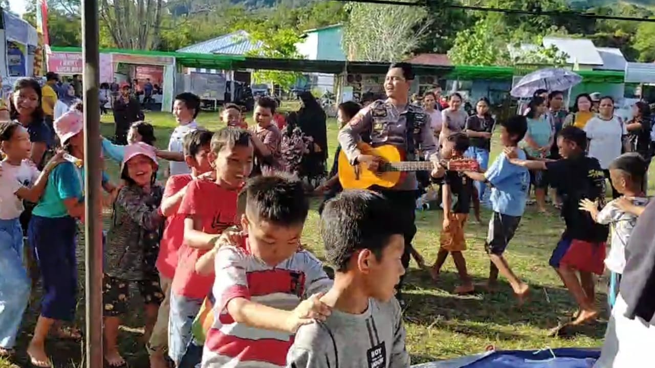Tampak kebersamaan Aipda Belmi Siallagan dan Bhabinkamtibmas Polsek Batang Lupar bersama anak-anak SD Negeri 1 dan SD Negeri 2 memadati stand Literasi di Lapangan Halaman Kecamatan Batang Lupar Kabupaten Kapuas Hulu, Kalimantan Barat.