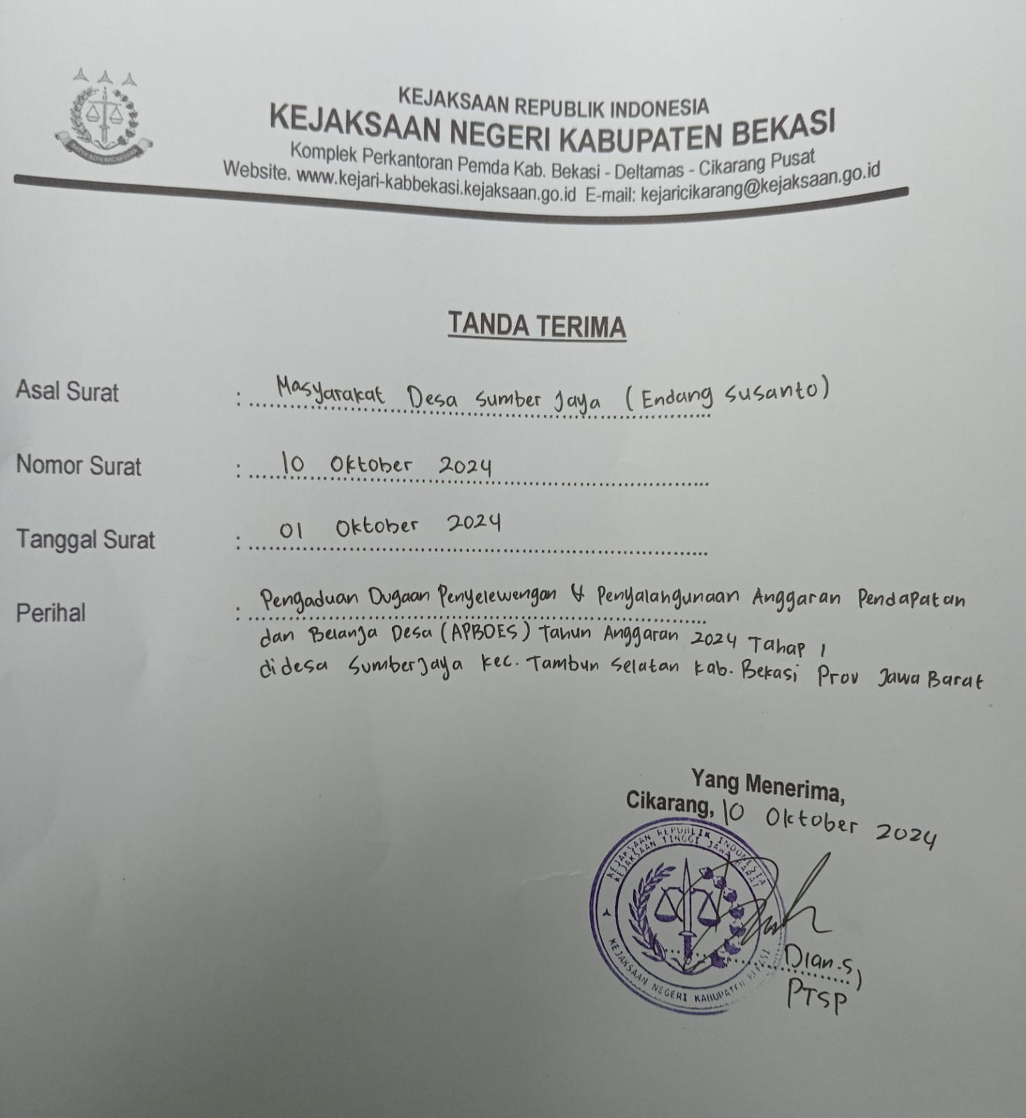PublikasiPendidikan.com | Kab. Bekasi, – Dugaan penyalahgunaan dan penyelewengan *Anggaran Pendapatan dan Belanja Desa (APBDes) Tahap I Tahun Anggaran 2024* di Desa SumberJaya, Kecamatan Tambun Selatan, yang kini sedang ditangani oleh *Kejaksaan Negeri (Kejari) Cikarang,* tengah menjadi perhatian masyarakat. Publik mendesak adanya kejelasan perkembangan kasus tersebut agar tidak berakhir sebagai wacana semata.